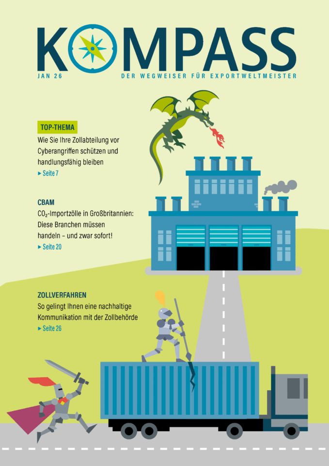 In der aktuellen Ausgabe der Fachzeitschrift KOMPASS erfahren Sie weitere nützliche Informationen zu UK-CBAM. Im Fokus der Ausgabe steht zudem, wie Sie Ihre Zollabteilung vor Cyberangriffen schützen können.