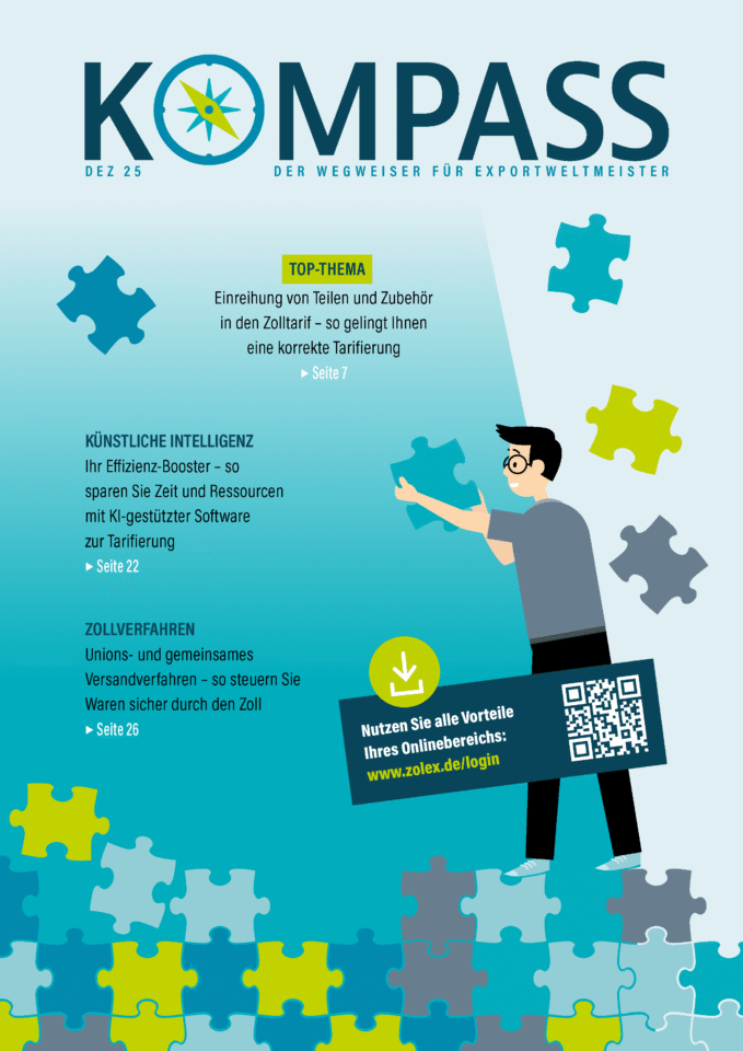 In der aktuellen Ausgabe der Fachzeitschrift KOMPASS geht es nicht nur um die korrekte Einreihung von Teilen und Zubehör in den Zolltarif, sondern auch um Künstliche Intelligenz als Effizienz-Booster in der Tarifierung, das zollrechtliche Versandverfahren und vieles mehr.