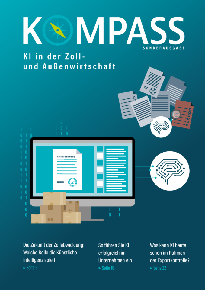 Dem Thema Künstliche Intelligenz widmen wir eine Sonderausgabe unserer Fachzeitschrift „Kompass“, wie immer mit informativen Grafiken von Viploria. Dabei geht es nicht nur um KI in der Exportkontrolle, sondern auch in der Zollabwicklung. Außerdem erhalten Sie Tipps dazu, wie Sie Künstliche Intelligenz in Ihre Prozesse integrieren können und welche Risiken Sie dabei beachten sollten.