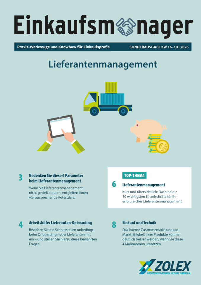 Die aktuelle Ausgabe von „Einkaufsmanager“ befasst sich mit dem Lieferantenmanagement. Vom Onboarding-Prozess bis hin zu Entwicklungsmaßnahmen ist alles dabei, um Ihnen ein erfolgreiches Management zu ermöglichen.
