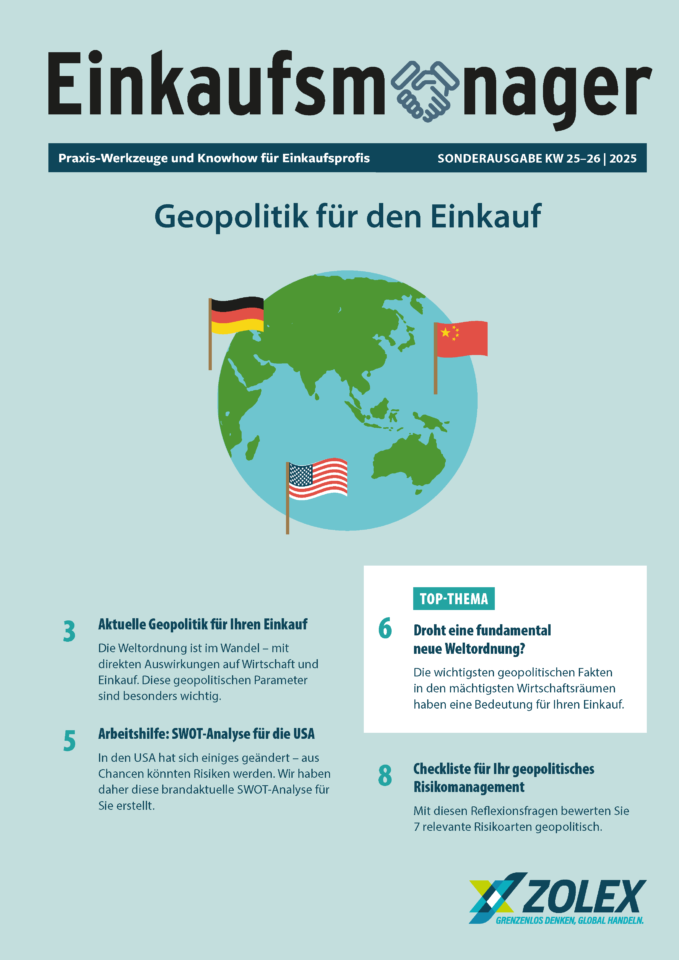 Wie sich die globale Weltwirtschaft derzeit neu strukturiert, erfahren Sie in der aktuellen Ausgabe von Einkaufsmanager, die sich umfassend mit dem Thema „Geopolitik“ beschäftigt. Neben nützlichen Arbeitshilfen zur Risikobewertung enthält das Heft auch eine rechtliche Einschätzung von Rolf Becker zur Sicherheit von Lieferverträgen im Falle eines Handelskriegs.
